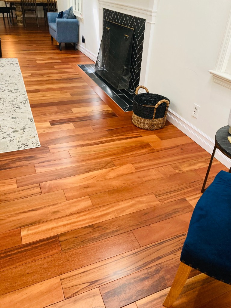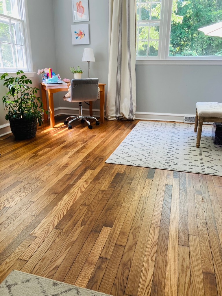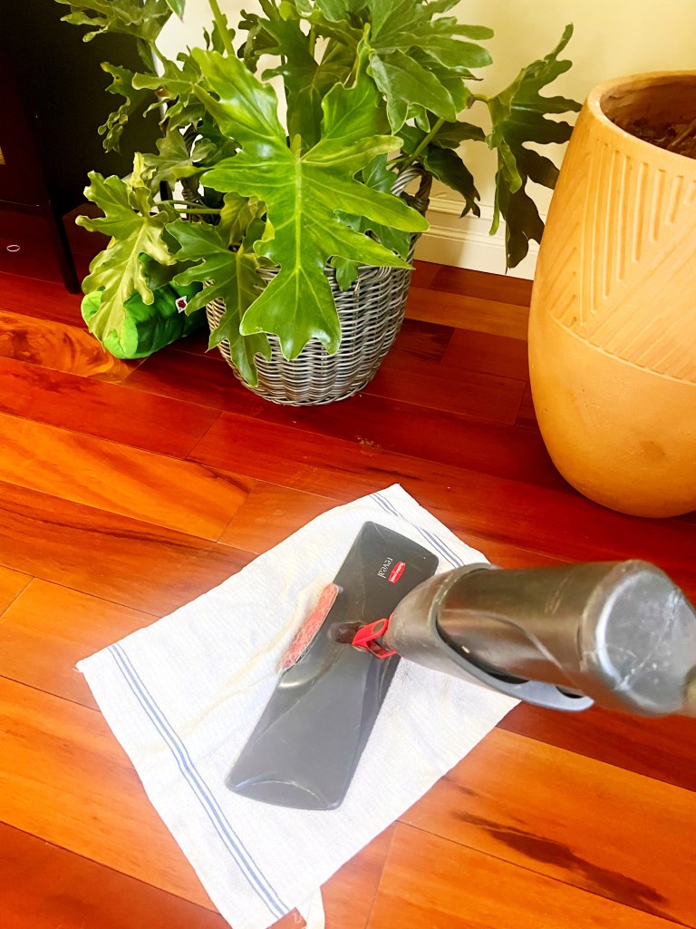 Another quick way to keep your hardwood floors dust-free is to take a slightly damp cloth with water (like a teaspoon of water on it, not much more) on the bottom of your floor cleaning stick (whatever that may be) and run it along your hardwood floors in between cleanings like shown below. The damp cloth method I do in between cleanings traps the dust onto the cloth and removes it from the floors. I either shake it outside or rinse it slightly to clean a large area. Sometimes a few rags may be necessary. You don’t want to wet the rag too much, bc then you may drag dirt around and leave streaks on your floors. You do not need to sweep or vacuum when you do this, because the goal is to remove dust, not dirt and stains. You can save that type of cleaning for your full floor cleaning days when you vacuum, sweep, and mop.